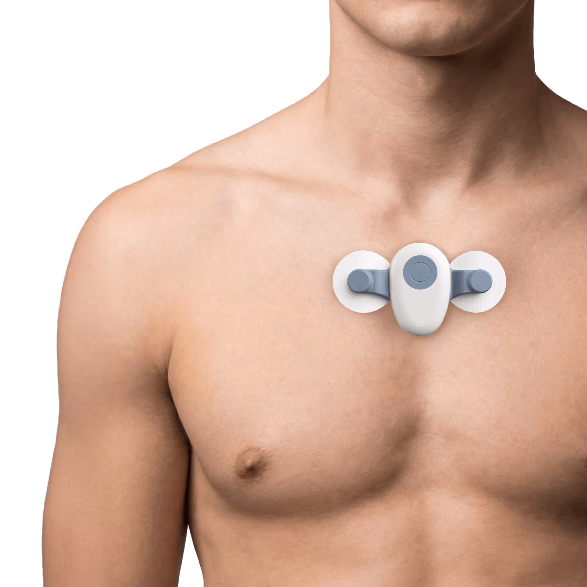 Chest placement optimal for ECG signal quality. Bioimpedance (BioZ) adds respiratory rate and fluid monitoring. LTE variant enables direct cellular upload without smartphone.
